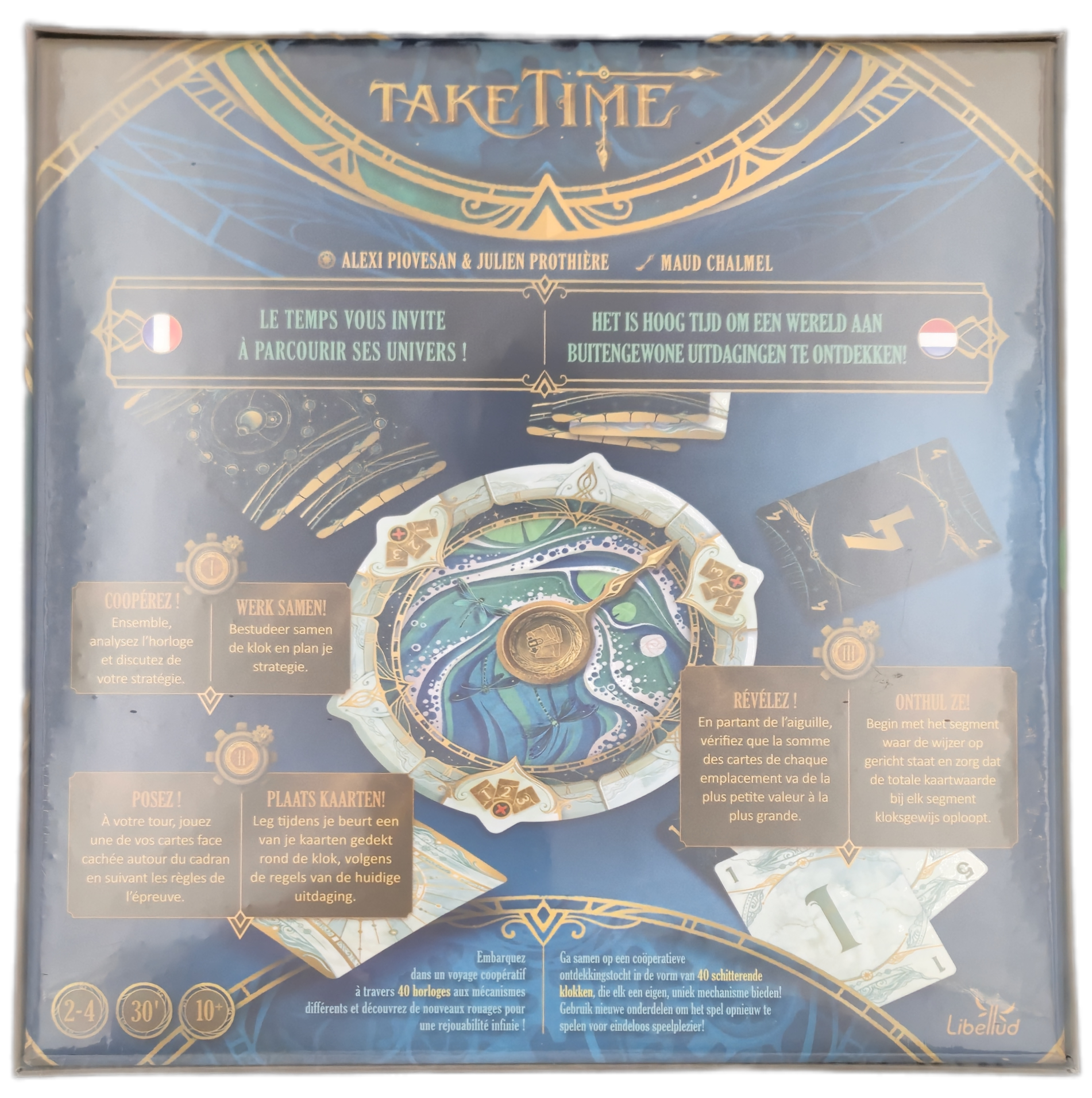 Take Time is een coöperatief spel waarin jullie de puzzels van verschillende klokken moeten oplossen. Hiervoor spelen jullie 12 kaarten gesloten rondom de klok. Jullie weten hoe de kaarten uiteindelijk verdeeld moeten zijn, maar jullie weten niet wat de anderen hebben gespeeld en mogen niet met elkaar praten. Het spel bevat 40 klokken met oplopende moeilijkheidsgraden en verschillende regels. Bereid je voor op een prachtige reis door de tijd!